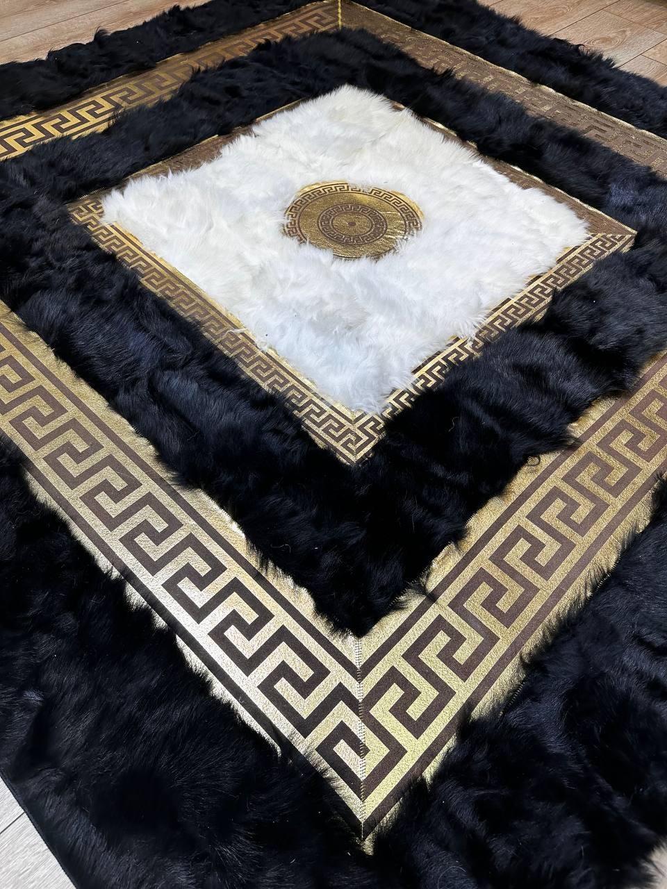 Indulge in luxury with our Black White Real Sheepskin Rug. Handcrafted for ultimate softness, this fluffy shaggy rug adds a touch of elegance to any room. Perfect for enhancing your decor with its unique blend of white and gold tones, it promises both comfort and style. Treat yourself to the plush feel of genuine sheepskin and elevate your space with this luxurious, handmade carpet. Ideal for creating a cozy and sophisticated ambiance in your home. Discover the perfect blend of luxury and comfort with our Black White Sheepskin Rug today!